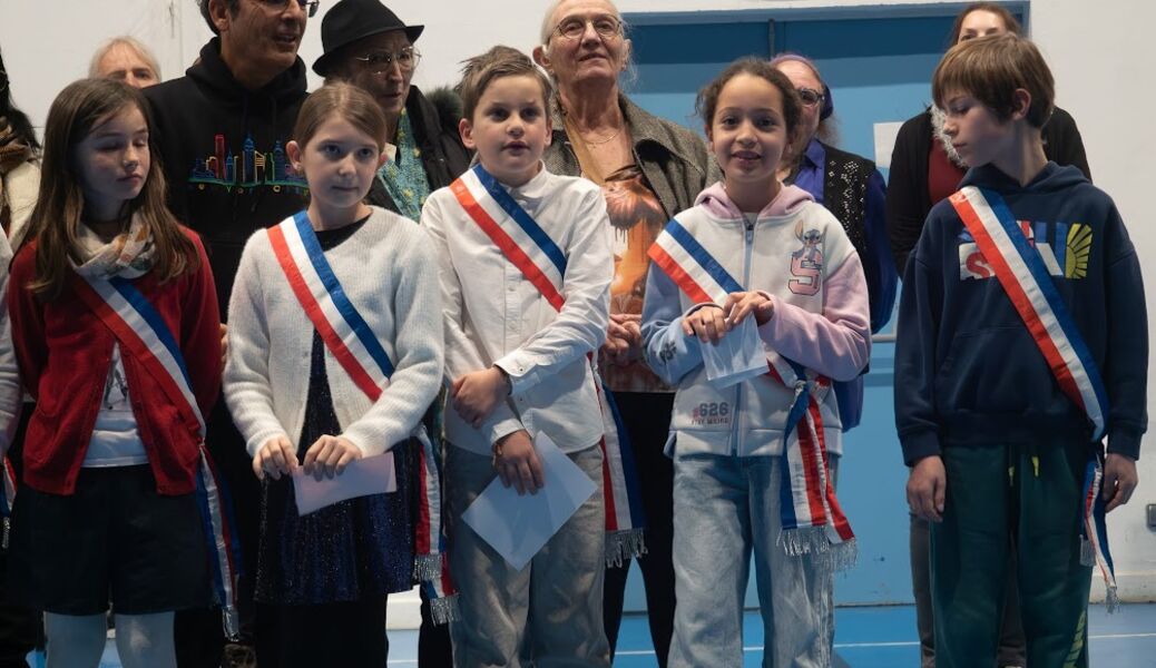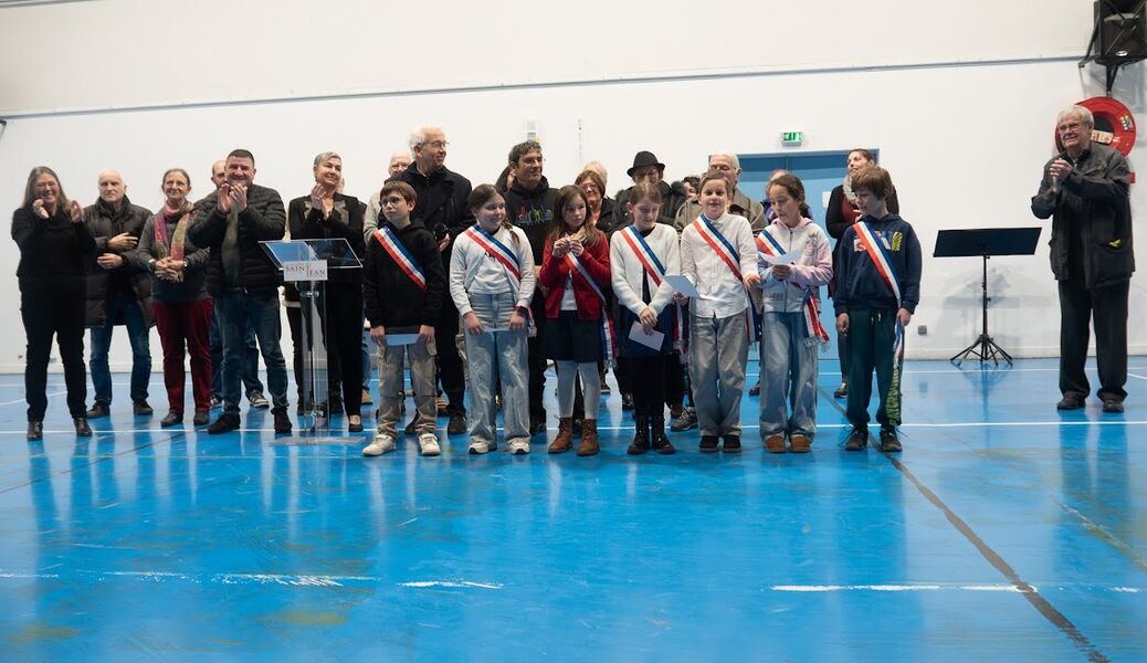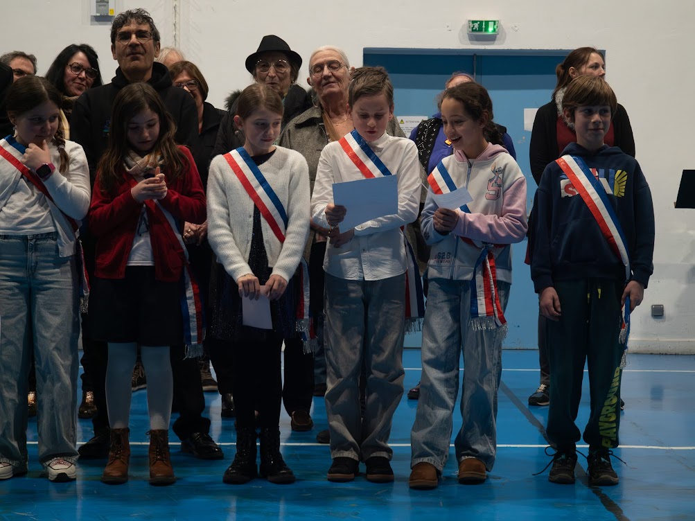 Cette cérémonie a été l’occasion pour les élus du Conseil Municipal des Enfants de présenter leurs travaux et leurs projets. Baptiste a pris la parole, entouré de Célia, Lili-Rose, Lilian et Alexis.